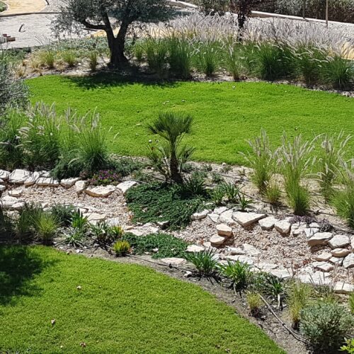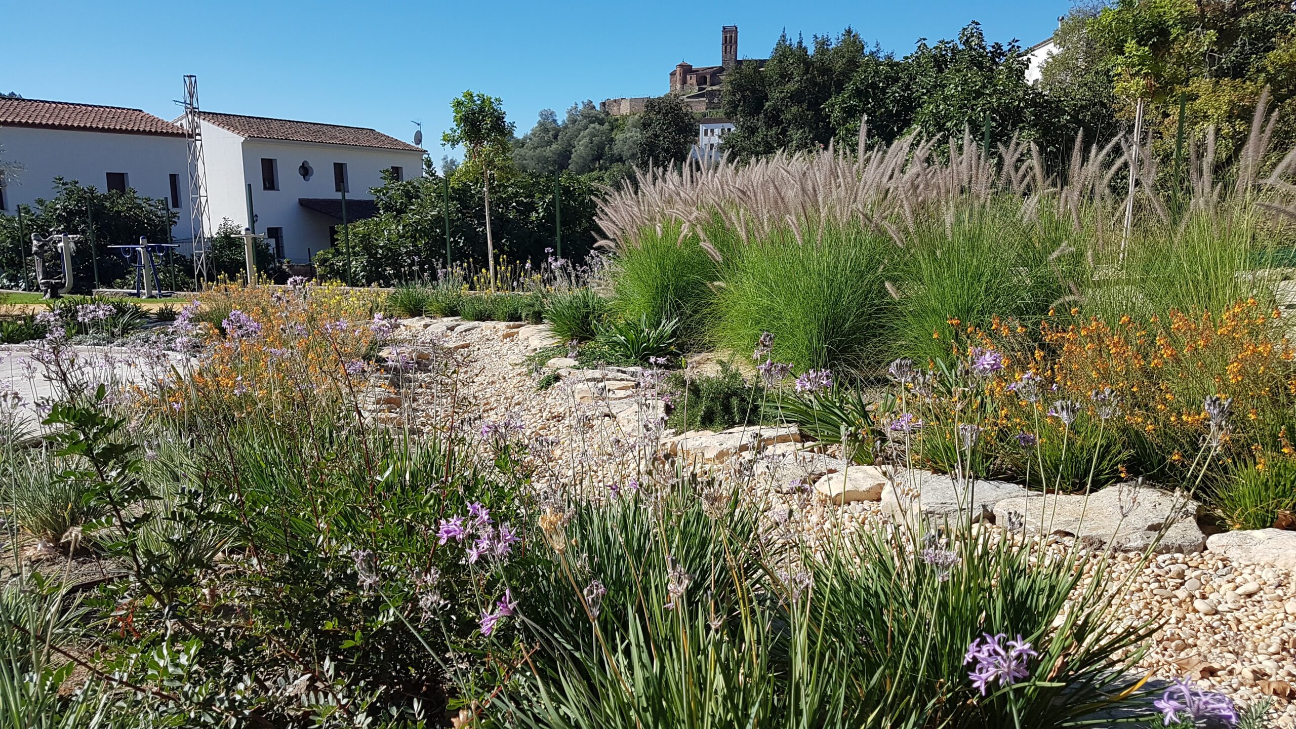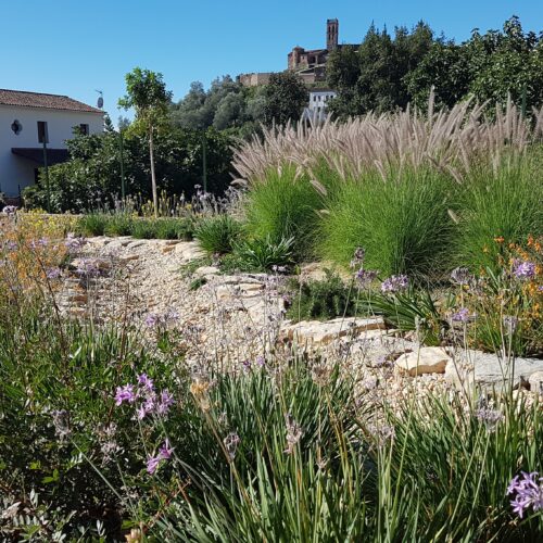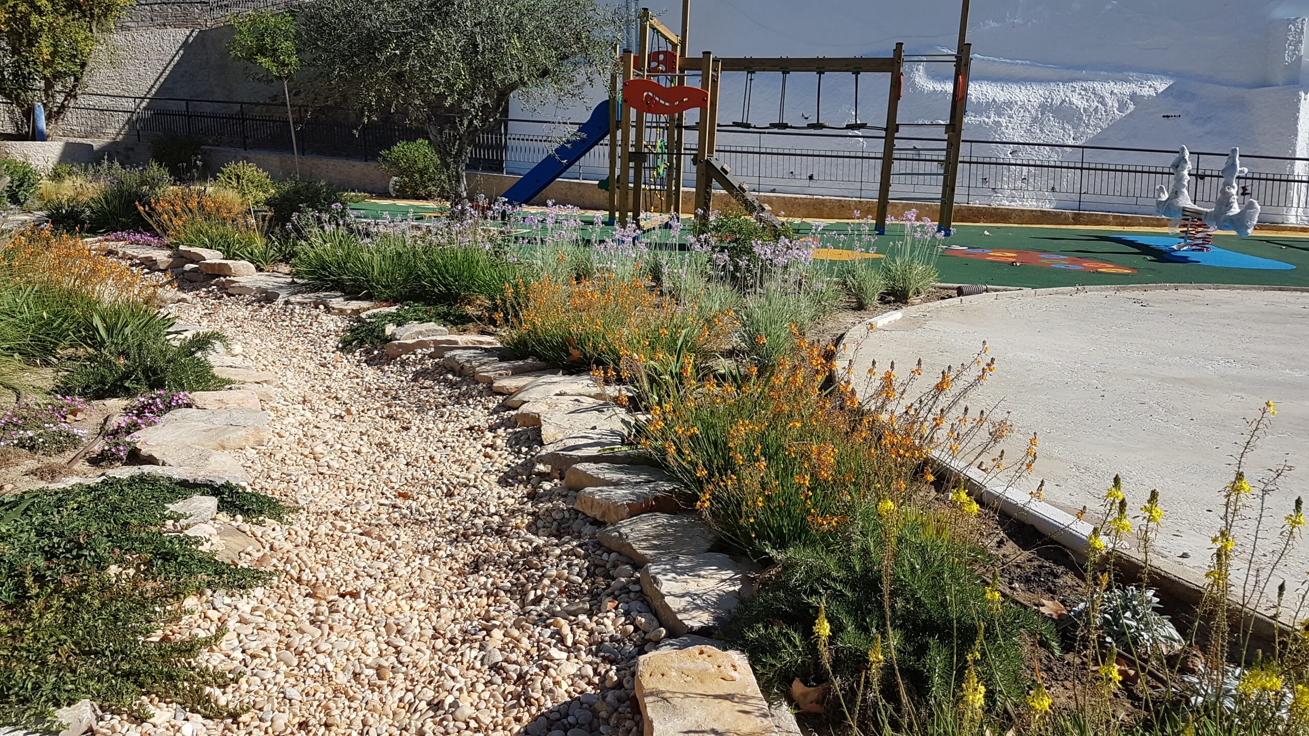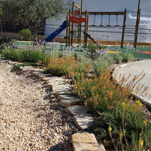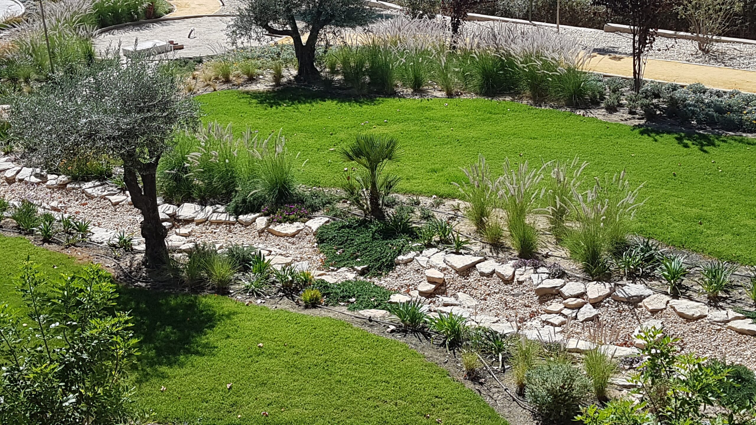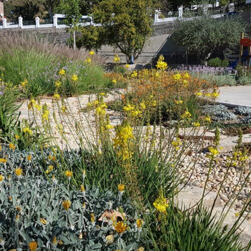 Para garantizar la sostenibilidad y el bajo mantenimiento, se utilizaron especies resilientes adaptadas al clima de la zona, como bulbines, gazanias, teucriums y westringias, que aseguran belleza y resistencia a lo largo del año.